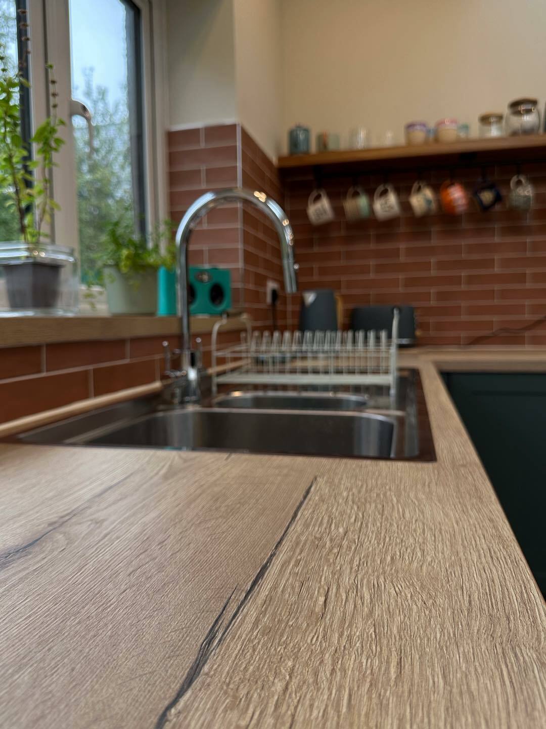 This kitchen combines modern elegance with natural textures for a timeless finish.