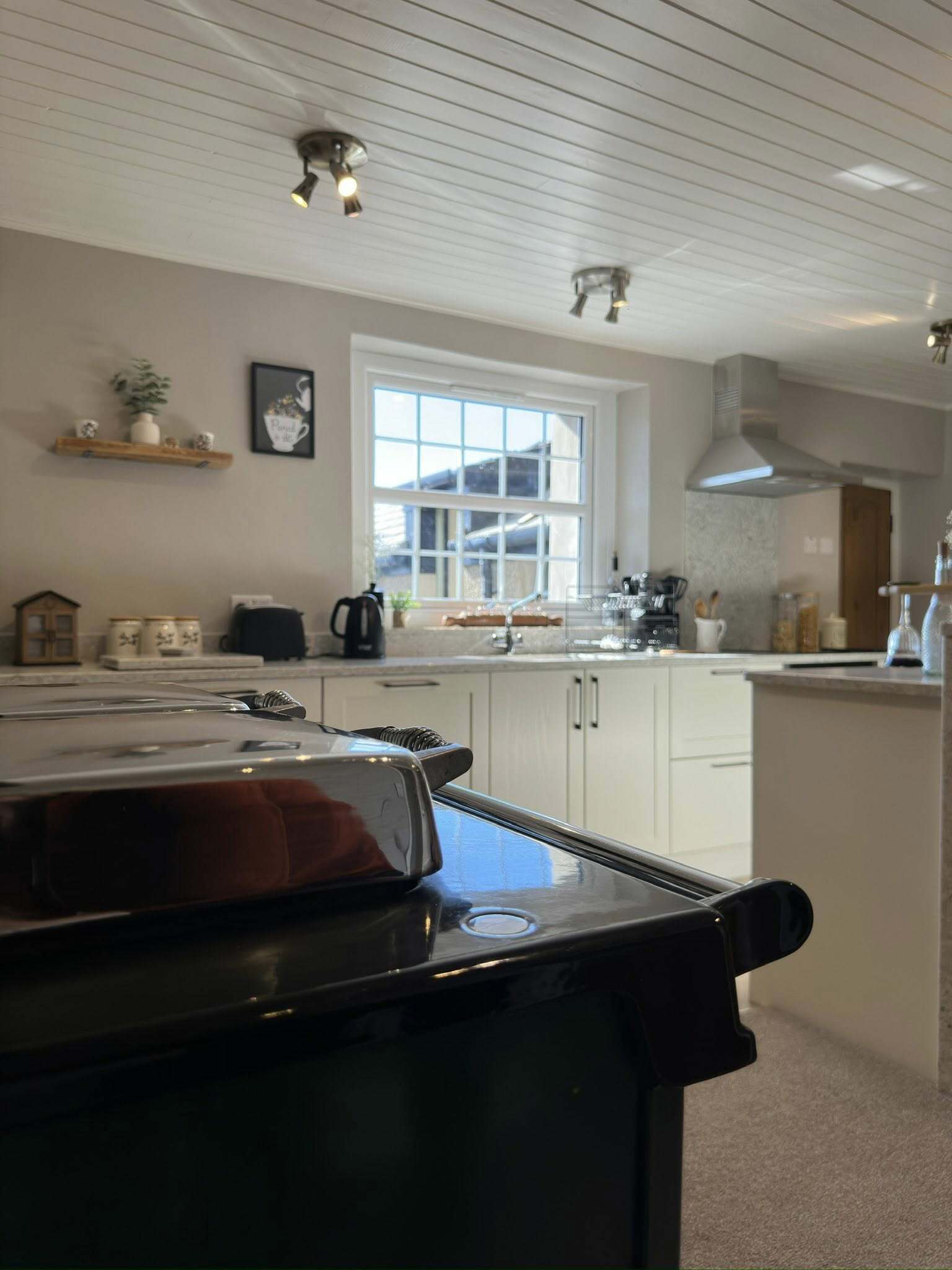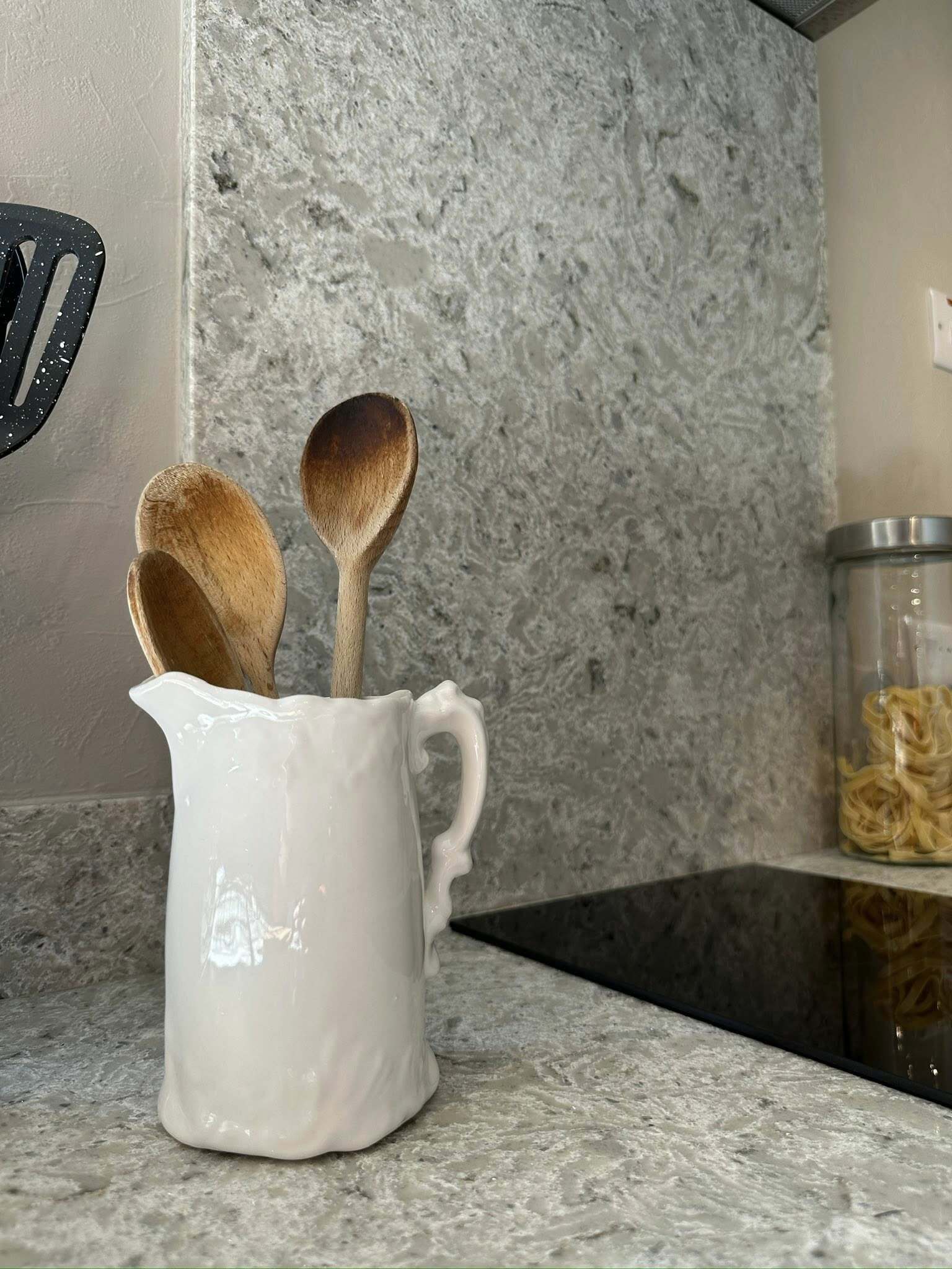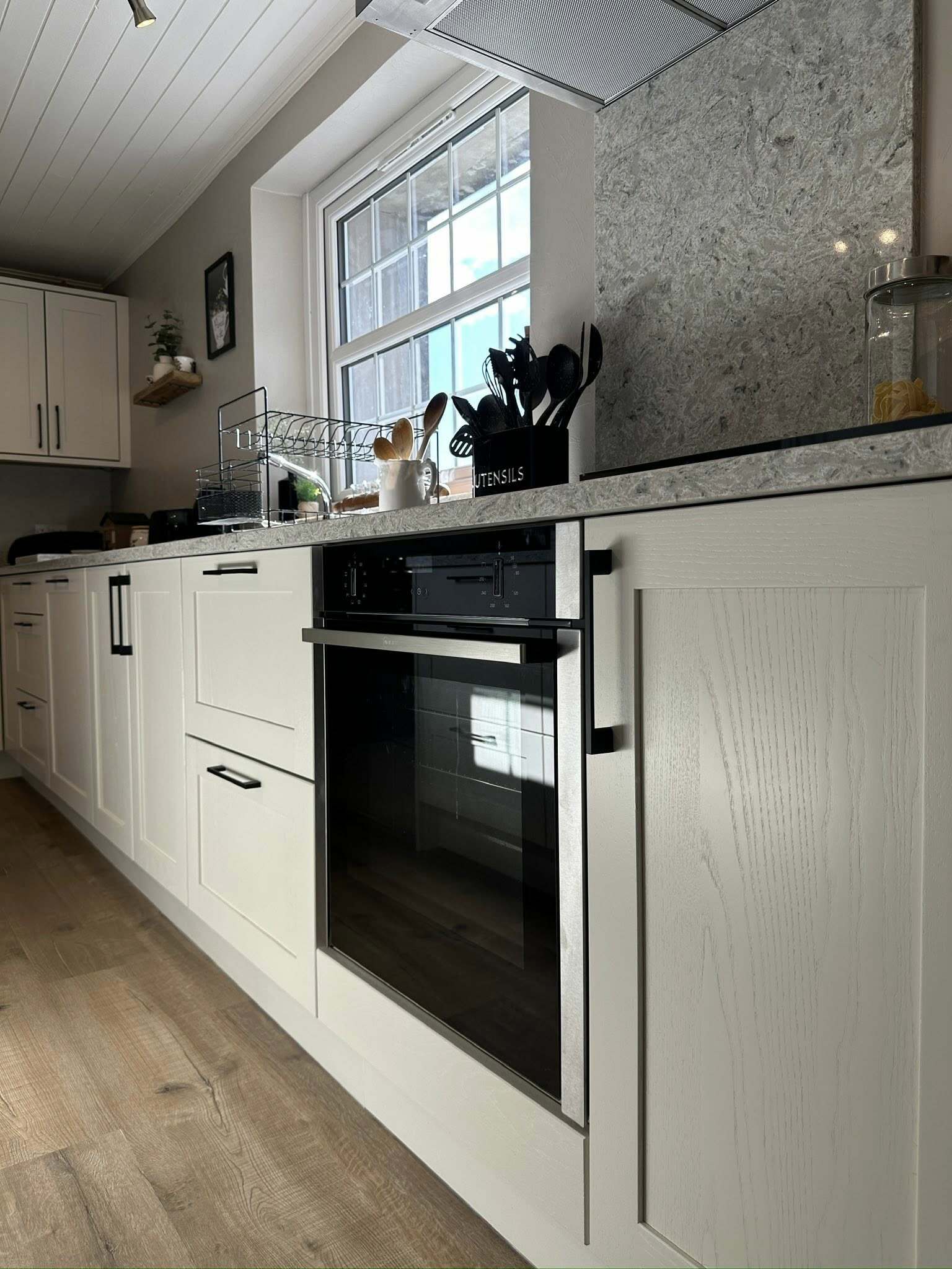 The Irini Quartz worktops were templated and supplied by @greyslateandstone, including the window sill, splashback and upstands to create a seamless finish. Crafted with care here in Porthmadog.