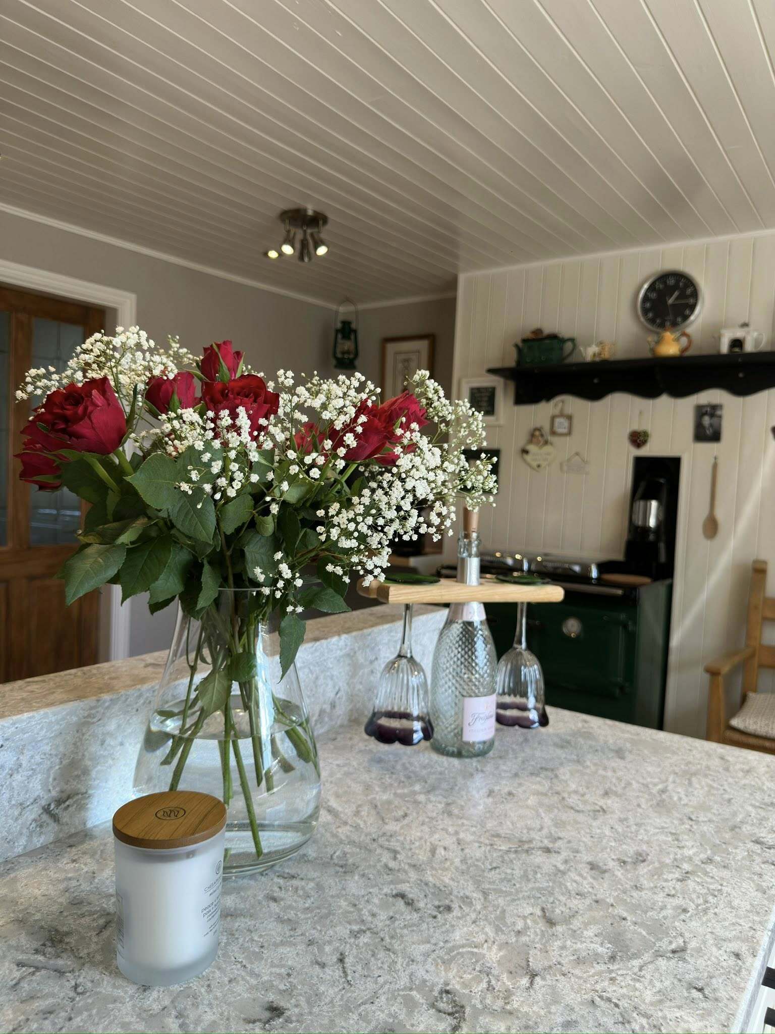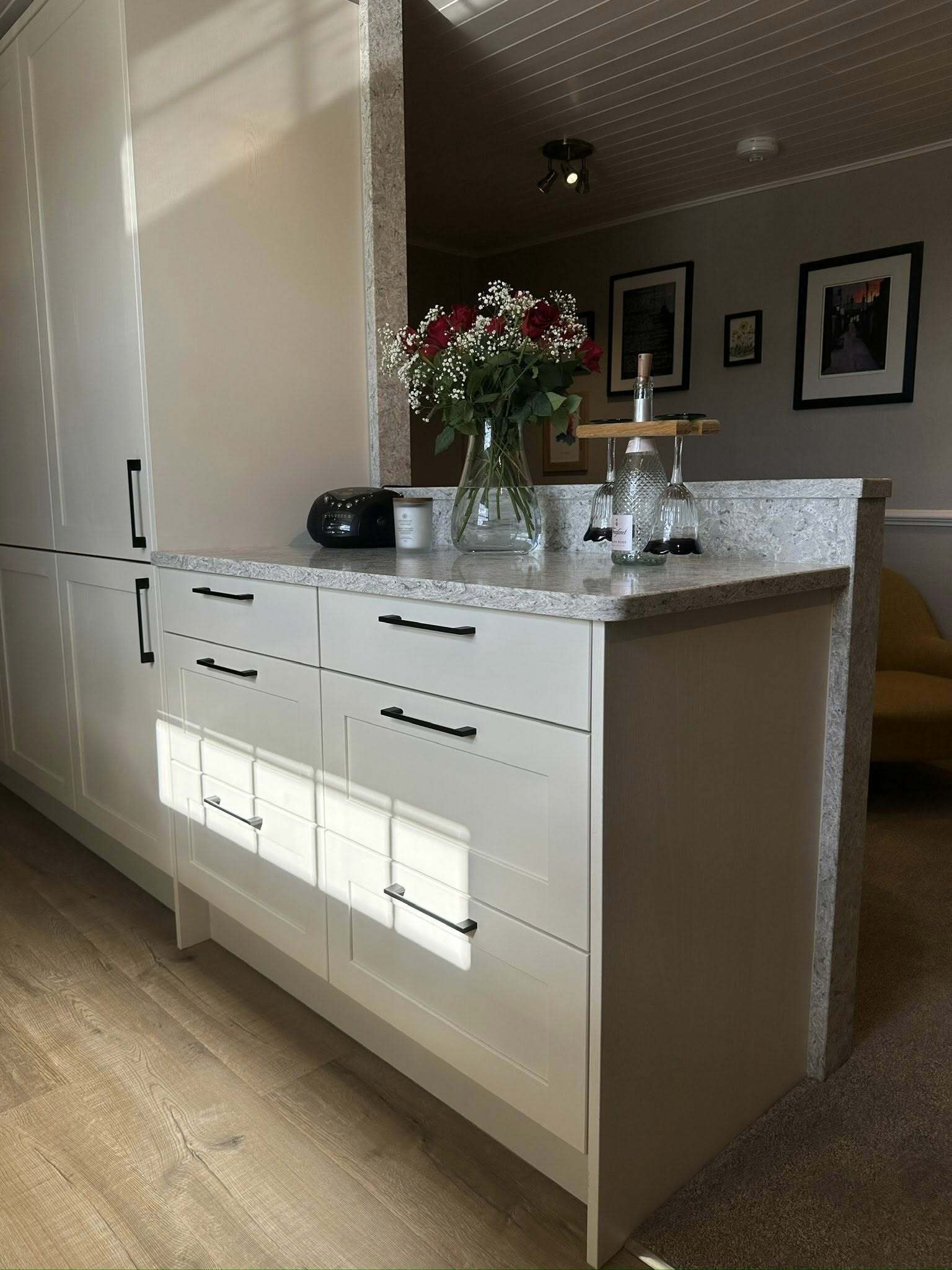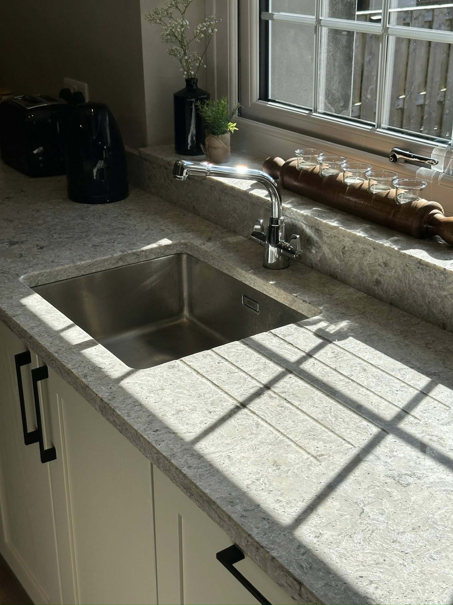 The Irini Quartz worktops were templated and supplied by @greyslateandstone, including the window sill, splashback and upstands to create a seamless finish. Crafted with care here in Porthmadog.